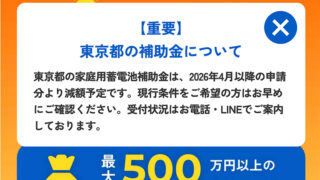 東京都の家庭用蓄電池補助金は、2026年4月以降の申請より、減額予定です。現行条件をご希望の方はお早めにご確認ください。